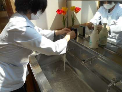 学校薬剤師の先生に水質検査を行っていただきました。安全のために、毎日の水質検査に加え、定期的な専門機関の衛生検査を受けています。
