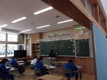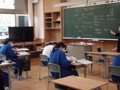 家庭の経済について学習しています。真剣な表情で話を聞き、ノートをとっています。