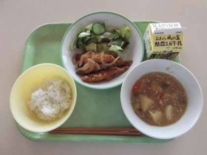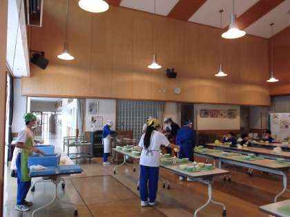 今日の給食は、ごはん、牛乳、わかさぎの南蛮漬け、きざみ和え、じゃがいものそぼろ煮でした。今年度の給食が始まって少ししか経っていないと思えないほど、手際よく配膳をしていました。