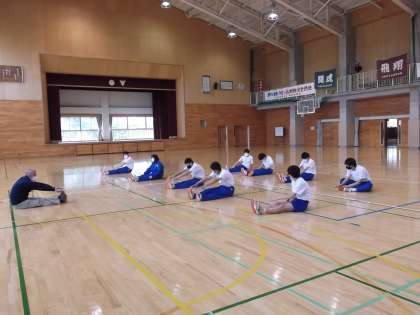 3年生の保健体育の授業では、スポーツテストをしています。今日はグラウンドで50メートル走のタイムを計った後、体育館でハンドボール投げの練習をしました。激しい運動の後なので、最後のストレッチを念入りに行いました。