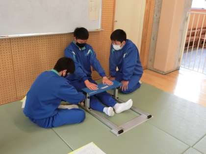 3年生スポーツテスト、長座体前屈の様子です。仲間と協力して測定しています。