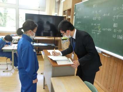 「先生、見てください。」仕上がった課題を先生に見てもらっています。また、T2の先生は、さりげなく寄り添い学習支援をしています。