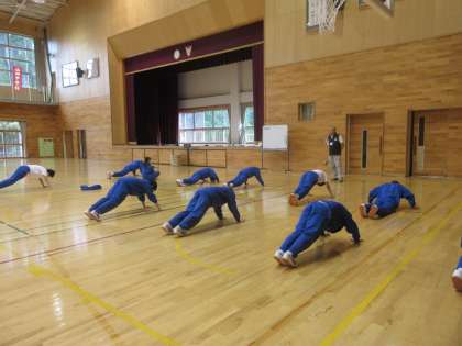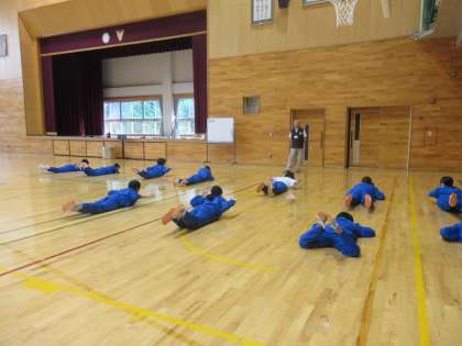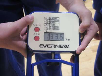 グランドでのハンドボールの授業予定でしたが、あいにくの雨天のため体育館に変更になりました。かけ声を合わせて背筋・腹筋は欠かしません。その後男女に分かれ握力を2回測定しました。