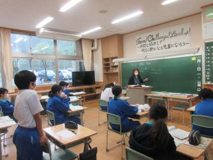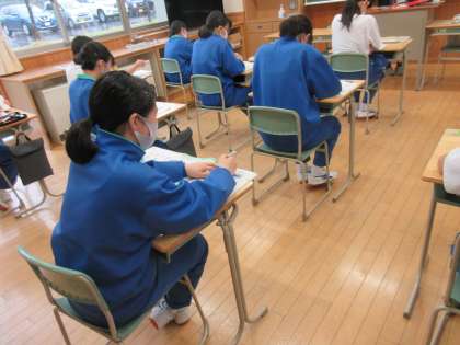先生の話を聞き、教科書の大切な箇所に線を引いています。