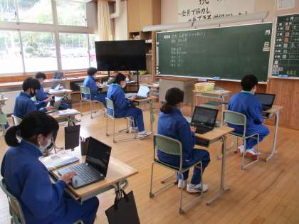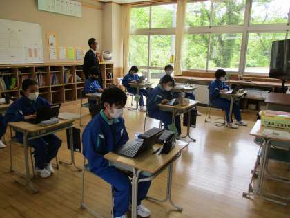 端末を使って、未来の製品について考える活動を行っています。「空飛ぶ車は開発しているって聞いたから・・・」と、真剣に考えています。