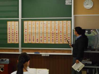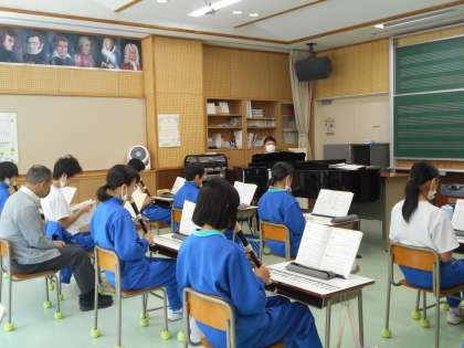 授業の最初は、アルトリコーダー演奏です。教科担任が手作りされた指表を参考にしながら、「きらきら星」、「威風堂々」、「ふるさと」を練習しました。