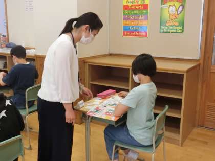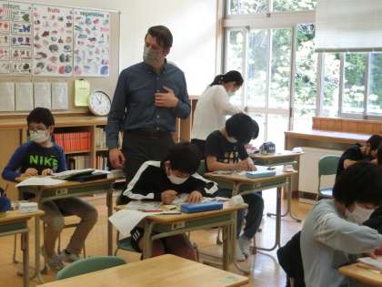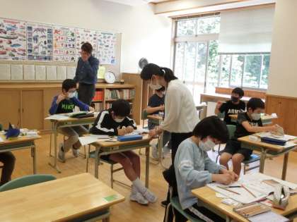 中学校英語教師による小学校5年生への乗り入れ授業です。学習課題は、英語でプロフィールを書こうです。ALTの先生とコラボしてきめ細やかな授業が展開されています。