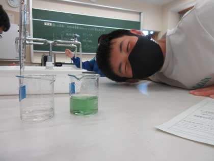 酸の水溶液にアルカリの水溶液を加えていくと、どんな変化が起こるか実験で確かめました。BTB溶液の色の変化に感動していました。