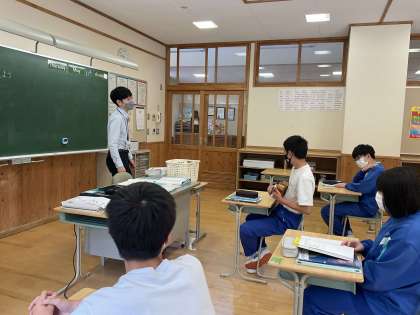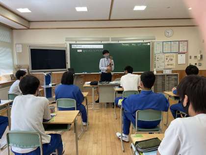 3年生の英語の授業では、最初にウクレレ(先生の趣味だそうです!)を用いて、既習表現の復習をしました。生徒たちは、初めて見るウクレレに興味津々でした。