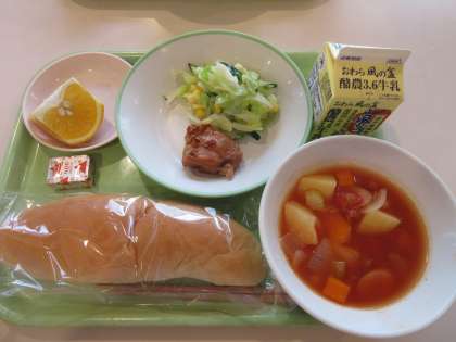 今日の給食の献立は、コッペパン、牛乳、照焼きチキン、コールスローサラダ、ミネストローネ、ポケットチーズ、甘夏みかんでした。