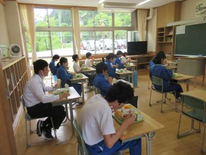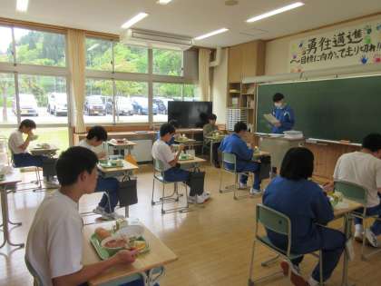 食事はもちろん黙食していますが、給食委員が各クラスでその日の献立について紹介しています。給食委員も毎日がんばっています。