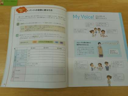 「夢の世界へ」に続き「翼をください」を合唱します。「翼をください」は、男女に分かれ二部合唱を練習しました。教科書で、パートの役割も確認しました。