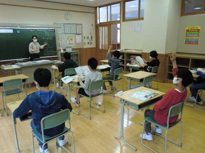中学校英語科教諭が小学校で授業をしています。