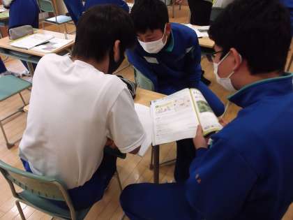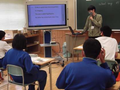英語の授業では、リスニングでディスカッションを聞き、メモを取っています。テーマは、修学旅行について。リスニング後は、文法の確認をしています。