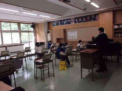 音楽の授業では、「We'll Find The Way 〜はるかな道へ」の曲に取り組んでいます。CDの曲に合わせて、楽譜を確認しています。