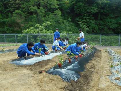 技術科の授業は、学校農園での野菜の苗うえです。トマト、キュウリ、トウモロコシ等をグループに分かれ苗うえします。収穫が楽しみですね。