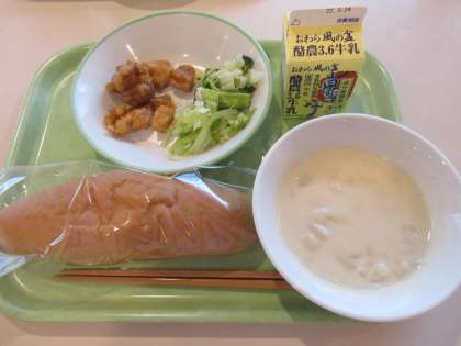 今日の給食の献立は、黒糖コッペパン、牛乳、鶏肉のマーマレードソースかけ、イタリアンサラダ、ポタージュでした。黒糖の甘みが感じられるコッペパンと、甘酸っぱいマーマレードソースの風味豊かな鶏肉がとてもおいしかったです。
