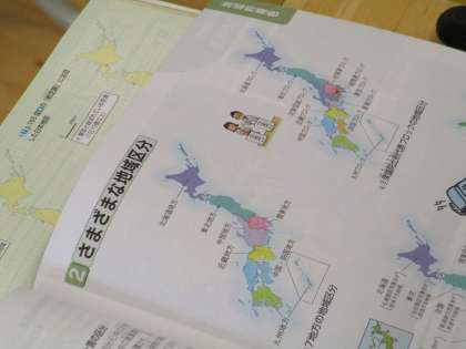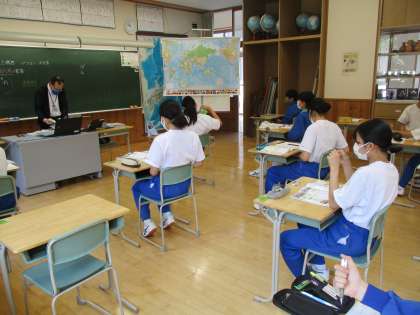 社会の授業では、日本の地域区分について学んでいます。昔と現在、日本を様々な地域で区分したとき、どの都道府県が入るのか確認をしています。生徒たちは、熱心に先生の話を聞いています。