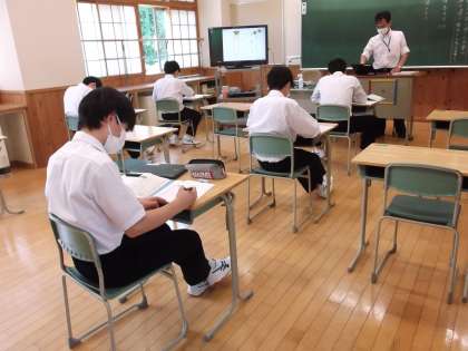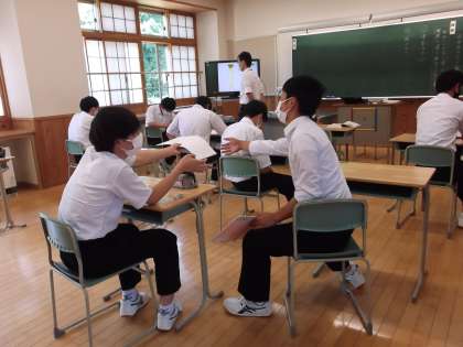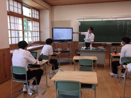 3年生では、文章の種類を選んで書こうという授業で修学旅行記を執筆しました。クロームブックを用いて調べ、自分が想像した修学旅行に行ったつもりで作成し、グループで見せ合いました。1泊2日で関東と関西の2つのテーマパークに行く修学旅行の感想を書いたり、一つの観光地に特化した旅行記を書いたりしていました。執筆中は真剣な表情でしたが、内容はとても楽しそうでした。