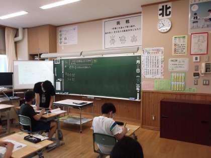 中学校数学教師による小学校6年生への乗り入れ授業です。学習課題は「分数をくふうして計算するには」です。教室の中では、自分の考えを教え合う姿が目立ちました。