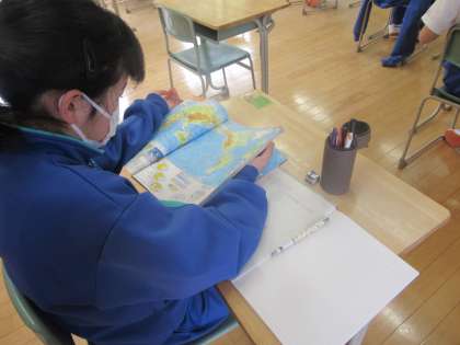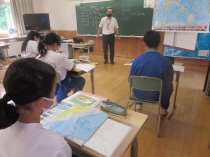 1限の授業は社会です。地理の学習で、世界の中でのアジア州について学びを深めていました。