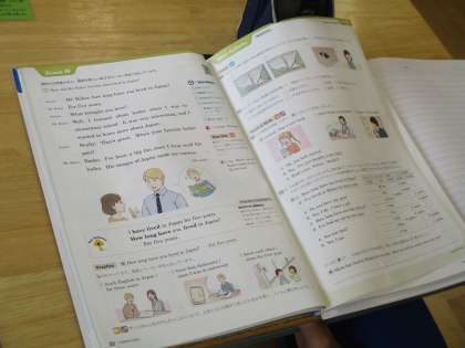 3年生は2時間目、英語でした。日本語の俳句と英語の詩の共通点や違いについての文章を読みながら、現在完了進行形の使い方について学びました。