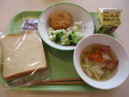 今日の給食の献立は、食パン、牛乳、コロッケ、花野菜サラダ、ひよこ豆のスープ、いちごジャムでした。