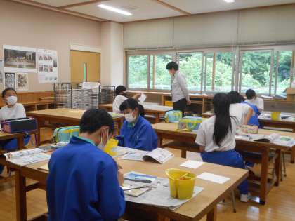 本日の学習課題は「水彩を使っていろいろな表現に挑戦しよう」です。生徒たちは、自然界の色を思い思いの色彩で表現します。