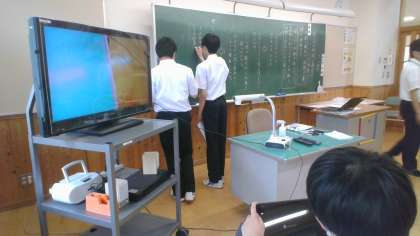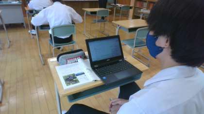 3年生の国語の授業では、「文章の構成や論理の展開を評価する」を課題に学習に取り組んでいます。自分の考えを黒板に書いたり、1人1台端末で調べたりしながら、学習を進めています。