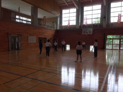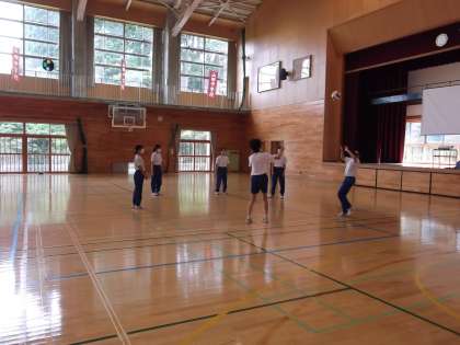 体育の授業は、「バレーボール」です。まずは男女混合で、2チームに分かれ、トス、パス、レシーブの練習から始めます。