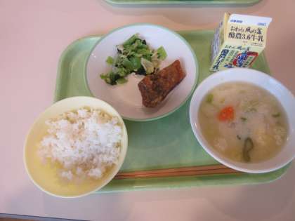 今日の給食は、ごはん、牛乳、魚の竜田揚げ、小松菜ひたし、呉汁でした。
