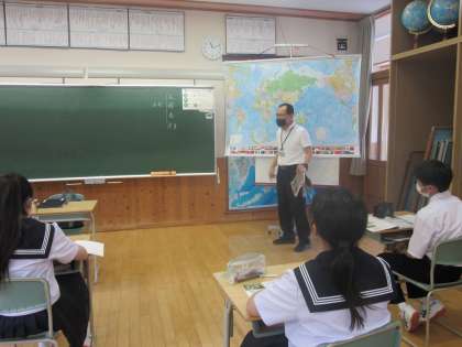 1年生の社会科(地理)では、国名とその由来、国境線等について学習を進めています。これから、世界の様々な地域の事象を知り、山田の地から世界へとグローバルな人材に成長していってほしいです。