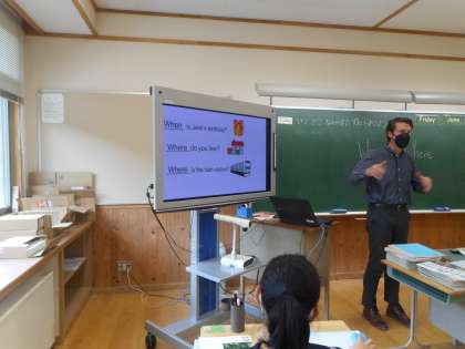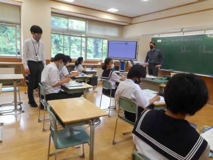 学習課題は「いつ、どこなのかをたずねられるようになろう」です。生徒たちはそれぞれ、ホワイトボードに英文を書き込み確認し合います。