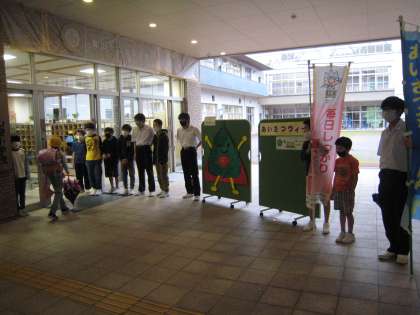 今日から中学校生徒会と小学校児童会共催の「あいさつ運動」が始まりました。