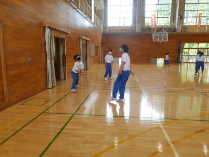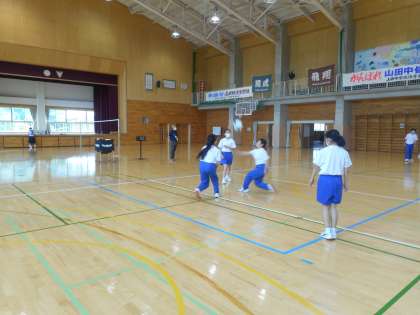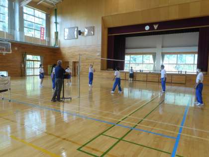 レシーブ、トスを練習した後、今日は、男子チーム3人対女子チーム4人で試合形式の練習をしました。