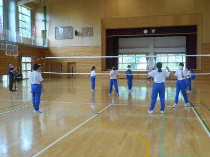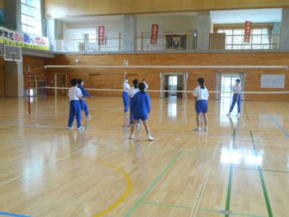 体育の授業は、「バレーボール」です。男女入り交じって、試合形式で練習します。点数が入ると、チームの中で拍手と歓声があがります。