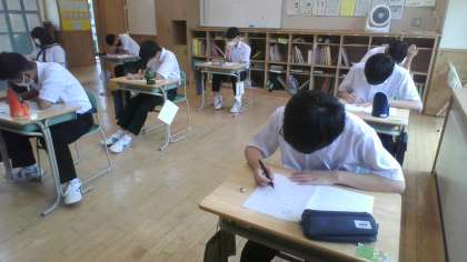 3年の数学では、授業の初めに平方根の表し方についての確認テストを行いました。今までの勉強の成果を発揮しようと、集中して取り組んでいました。