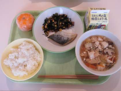 今日の給食は、ごはん、牛乳、鰆の西京焼き、ひじきのソテー、豆腐の野菜あんかけ、冷凍みかんでした。