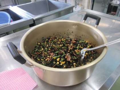 ひじきのソテーは大きい鍋で炒めてあります。苦手な児童生徒が多いのではという予想に反し、残食はほとんどありませんでした。