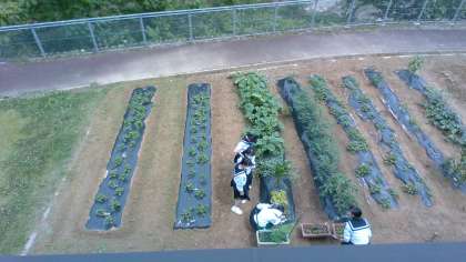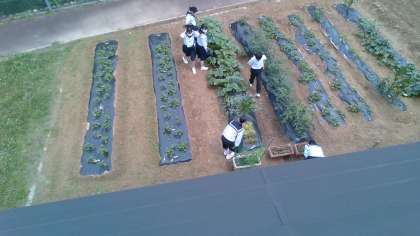 昼休み、2年生の生徒が技術科の授業で栽培している野菜の生育状況を確認していました。