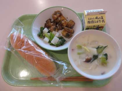 今日の給食は、米粉コッペパン、牛乳、魚とレバーのえごまだれからめ、かぶのサラダ、中華クリームスープでした。米粉コッペパンは、甘くて柔らかくおいしかったです。えごまだれで味付けされた魚とレバーは、ごまの風味も混ざり、とてもおいしかったです。