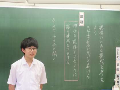 5限の国語では、「相手を説得できるように話の構成を工夫しよう」の課題のもと、社会に対する思いをスピーチ発表しました。ウクライナ情勢や世界の食品ロス問題等、中学生の社会に対する考えを理路整然と分かりやすく伝えていました。生徒全員が自信をもって何も見ずにスピーチする姿に頼もしさを感じました。