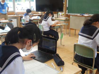 来週から始まる期末評価に備え、今までの既習した範囲をプリントで復習しています。端末を利用したり、教科書を見返したりして、学習を進めます。