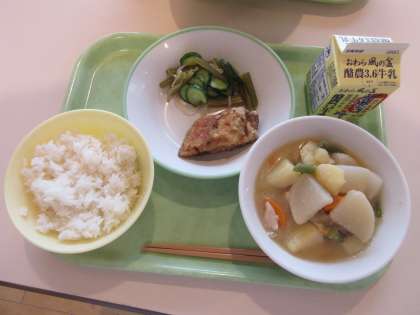 今日の給食は「かみかみ献立」で、ごはん、牛乳、魚の梅風味かば焼き、茎わかめの中華和え、じゃがいものみの煮込みでした。かみ応えのある食材は、茎わかめ、こんにゃく、ごぼうです。