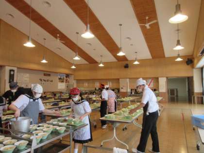 給食当番は、自分が何をする必要があるか周りを見てよく考え、協力して配膳していました。