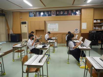 授業の初めに、アルトリコーダーを練習します。指づかいに気を配りながら、最初に演奏する曲は「よろこびの歌」です。