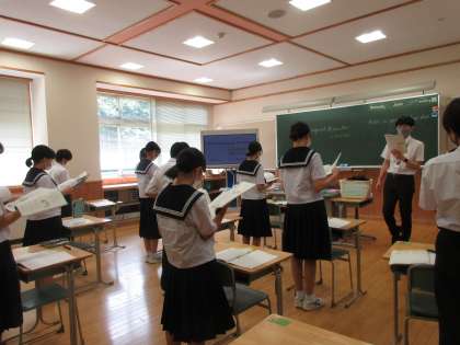 先生の後に続いて、使用されている英文を読み、発音をまず確認していました。