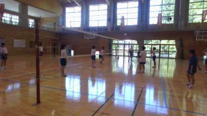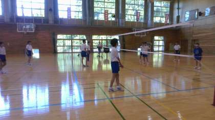 2年生は体育の授業で、バレーボールに取り組んでいます。今日は2チームに別れて試合を行っています。1点決まるたびにチーム内で声を掛け合っています。