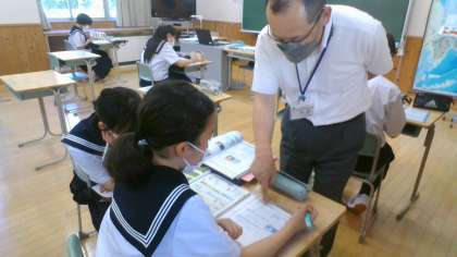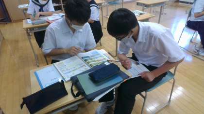 1年生は社会の授業で、様々な気候のついて特徴をまとめ、ワークに取り組みました。ペアで確認し合ったり、先生に教えてもらいながら学習を進めています。
