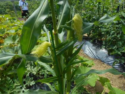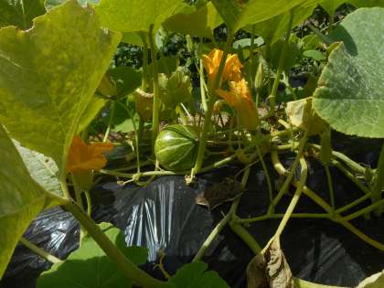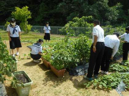 5月下旬に植えた野菜の苗が、大きく成長し実を結んでいます。生徒それぞれが、自分の野菜の育成技術(支柱、誘引)を確認します。